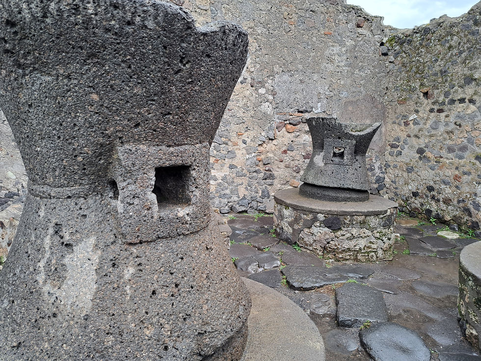 Grain mills and ovens survived, often found together in the ruins. One was even reconstructed to show everyone how large the mill was, with a mule often being used to mill the grain.